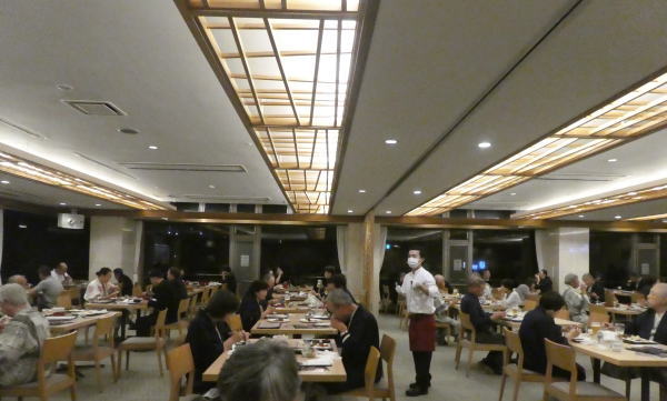 お風呂から出ると少し歩き疲れたので部屋で横になり一休み。 17時半夕食時間になって一階レストランへ。 ここもソーシャルディスタンスを考えて席を割り振っているので 入口には長い列。 |