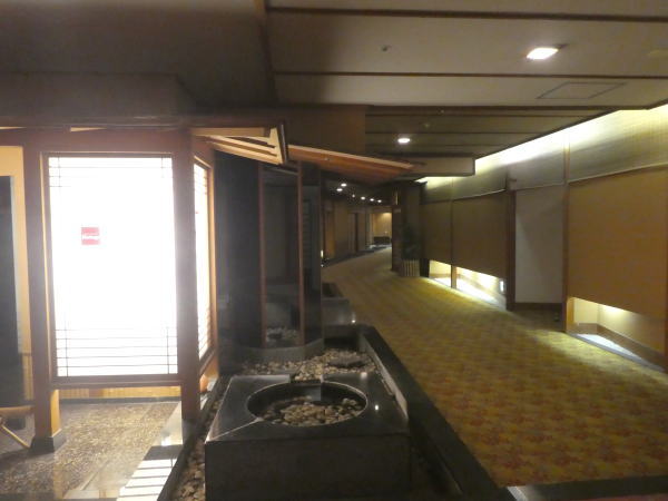最初に3階大浴場に入って汗を流しゆっくり浸かってから、一度浴衣に着替えて、廊下を渡って露天風呂専用エレベーターに乗って渓流露天風呂へ。 渓流露天階は内風呂とサウナ、4つの露天風呂がある。時間をかけて全部入る。 |