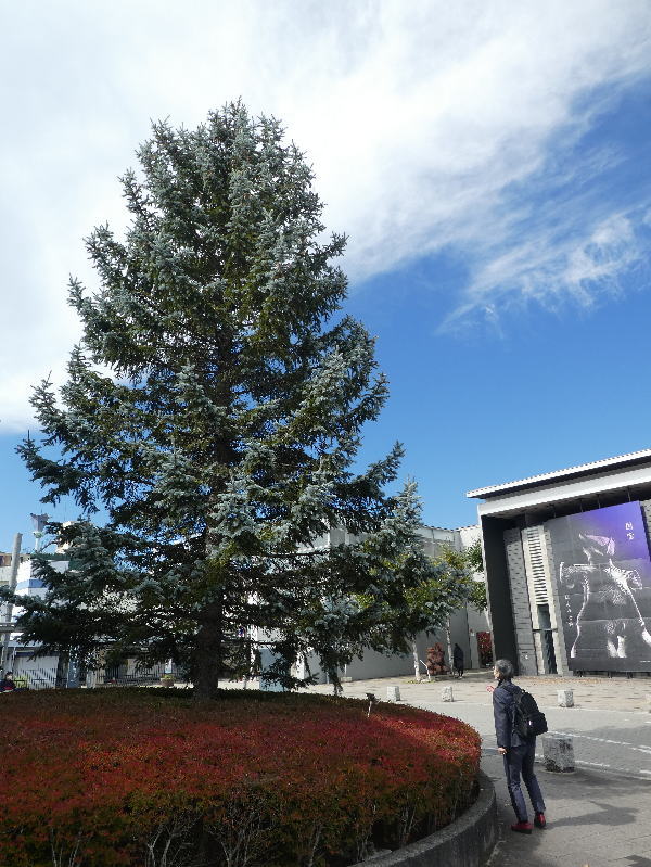 茅野駅前広場に巨大なもみの木と思ったら、プンゲンストウヒという、マツ科の常緑針葉種。 綺麗な木だ。 広場には茅野の誇り、こんな彫像「仮面の女神」と「縄文のヴィーナス」も。 |