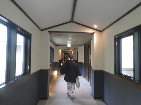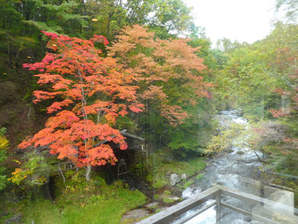 渓流露天風呂へは長〜い渡り廊下を渡っていく。渓流の木々も色づきはじめている。 |