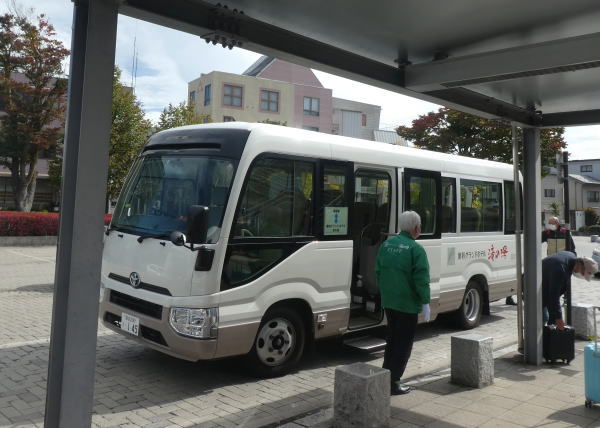 茅野駅前で蓼科グランドホテル滝の湯の送迎バスが待機していた。 名前を告げ乗車の際アルコール消毒をして乗車。マイクロバスだがこんな時期でも満員の乗客。 |