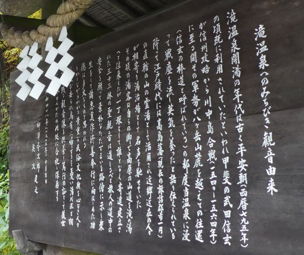 駐車場わきに33体の観音さま像。 グランドホテル蓼科・滝の湯は大正12年創業の老舗旅館で天皇陛下が皇太子時代に4度も宿泊された由緒ある温泉旅館。諏訪の高島藩直轄の山の霊湯でもあったと記載されている。 |