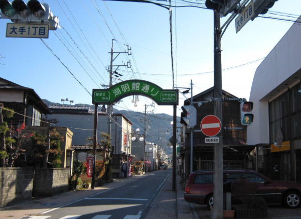 「湖明館通り」の名前の由来は、明治時代に諏訪湖開発の先駆者諏訪出身の金子兵助氏が建設した「金湖園湖明館」という貸席(時間で席を貸す座敷)があり、そこへ続く道沿いに商店が並び、現在の街並みが出来た。 この通りは7年目に一度の「手長神社御柱祭」の際曳行(えいこう)がこの狭い通りを抜けていくらしい。 諏訪大社御柱祭⇒ |