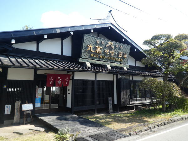 「丸高蔵 みそ茶屋千の水」の前を通る。 1916年(大正5年)創業の信州みその老舗で、創業にあたり、醸造蔵である鰍沢蔵は、驚いたことにに我が故郷、山梨県富士川町鰍沢から穀蔵を移築した大きな土蔵だった。それとともに吉沢蔵は山梨県の紡績工場の倉庫を移築。 |