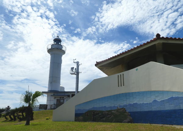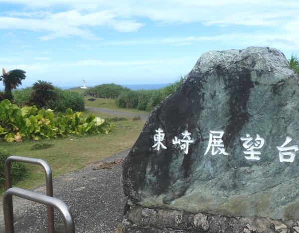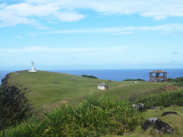 島の東端/東崎(あがりざき)灯台からは西表島(いりおもて)が見える。島一周サイクリングも目的地の与那国島空港まではあと一息。 |