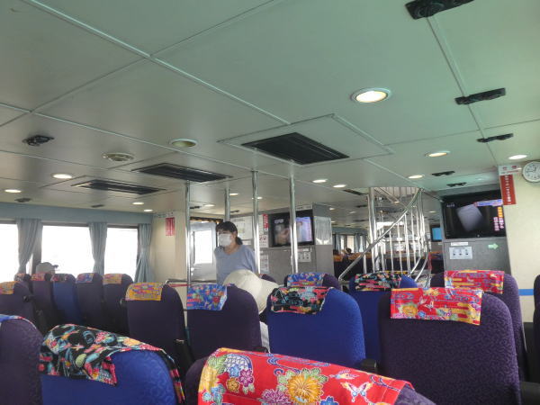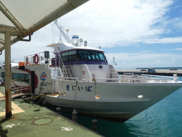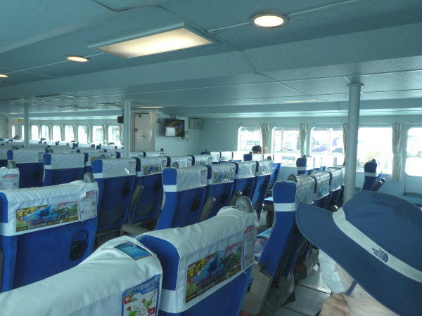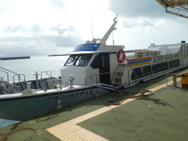 石垣港離島ターミナル12:50発に乗船、きれいな船室で空調も快適、小浜島まで所要40分で到着。 |