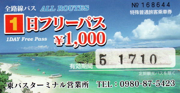 石垣島の天気予報は数週間前からチェックして今日から一週間ほぼは晴れの予報、しかし着陸すると小雨が降っている!予報の不確かさに少し腹を立てながら降機し到着ロビーへ。 1日乗り放題のフリーパスを買って、石垣バスターミナル行のバスを待ち乗車。 |