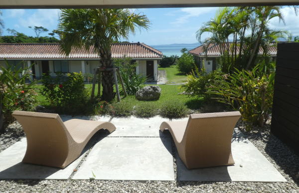部屋はガーデンビューの32号室。広く清潔、ベランダにソファや寝椅子も置かれなかなかデラックス。大窓から遠くに海岸も見えるし落ち着いて いい部屋。 |