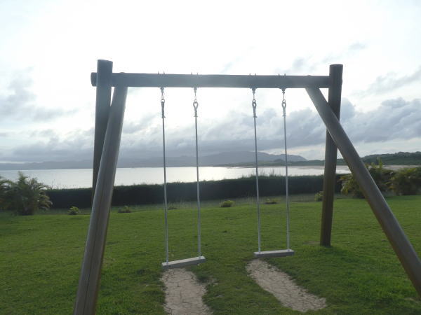 サンセット広場は芝生にベンチやブランコもあって。海岸の向こうは西表島で夕陽は島影に沈んでいく。 |
