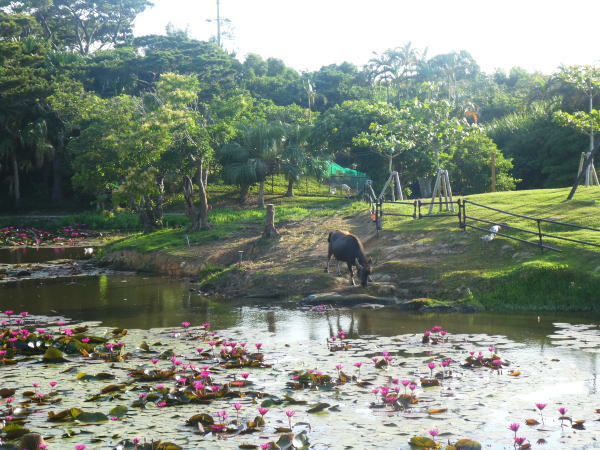 朝食は32号室からセンター棟へ、水牛の太郎とおすぎ、大二郎が放し飼いされている睡蓮の池を通って行く。角があるので2m以内は近づかないでの注意書。 |