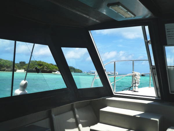 川平マリンサービスのグラスボートに乗船。船内は中央に海底が見通せるガラス窓で、挟むように両側が客席。数名づつが座ったところですぐに出航のアナウンス。 |