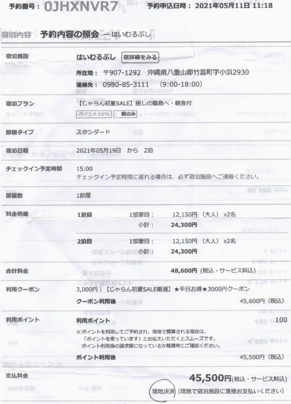 5月21日 「はいむるぶし」7時~朝食すませ。清算をする。 |
