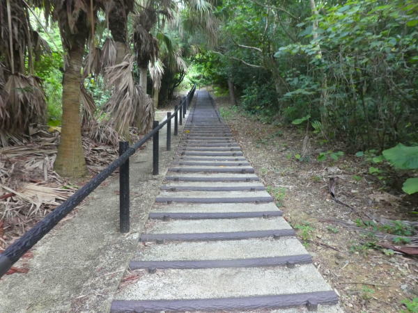 「こはぐら荘」をあとにして、島一番高いといっても標高99㍍大岳(うふだき)と西大岳(にしうふだき)に向かい登りやすいという西大岳にする。100段ほどの石段を登と山頂。360°頂上広場から島全体をが眺められる |
