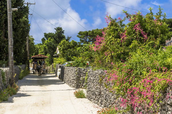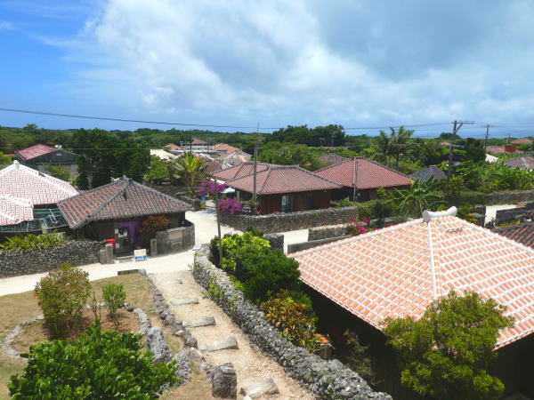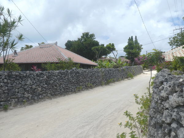 レンタサイクル店を出て石垣の通りを進む。どの家も敷地が石垣で囲まれ屋根は必ずシーサーが構えている独特の赤屋根。石垣はただ積んでいるだけで石と石の隙間は強風が吹くと風が抜ける構造になっている。 |