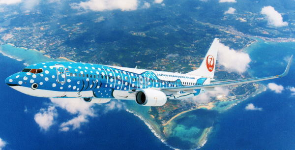 ジンベエジェットは「沖縄の海との出会い」を展示テーマとする「沖縄美ら海水族館」とコラボレーションで実現したJTAのオリジナルペイント機。沖縄の魅力を伝えたい想いを海水族館にいるジンベエザメをイメージし作られた。 |