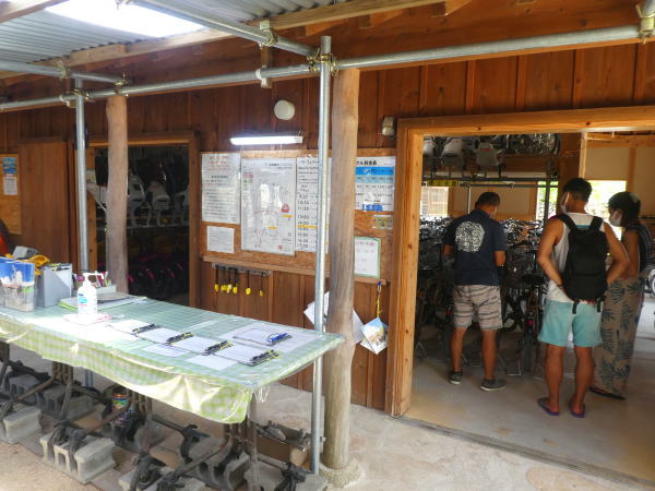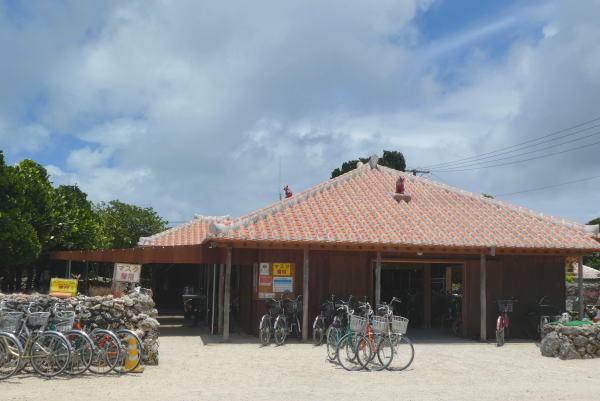 友利レンタサイクル店は港から10分位。 店に着くとスタッフから簡単な説明があり、書類に名前住所など記入、自転車2台を一時間借り島内観光に早速出発。 |