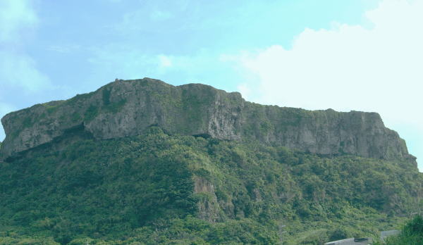 与那国島三つの集落の中で島一番の集落・祖納 の西に屏風のようにそそり立つ石灰岩の断崖 標高85m「ティンダハナタ」下を走り抜けると与那国島空港はあと一息。 |