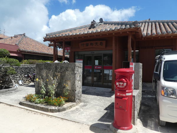 シーサーを載せた赤瓦葺の竹富島郵便局。左折して西側の浜に向かう。 |