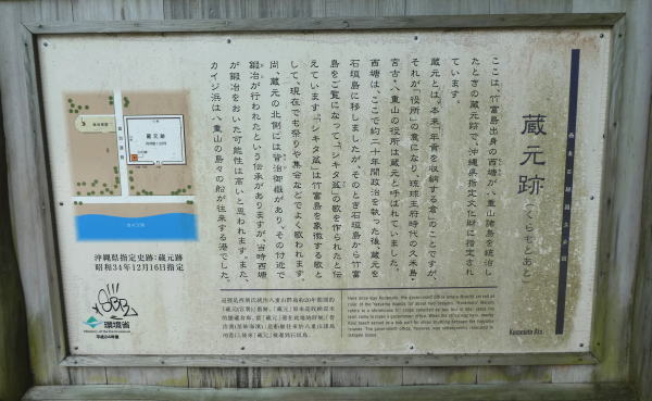 「蔵元跡」とは、 竹富島出身で琉球王府に仕えていた西糖が、八重山諸島を統治していた時に使っていた蔵元の跡。蔵元とは年貢を収納する倉を意味し、それが役所を意味するようになり、八重山、宮古、久米島では役所の事を蔵元と呼んでいた。 |