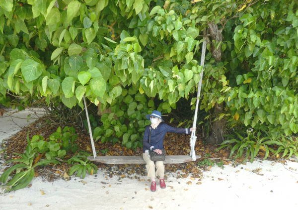 ビーチテラスの前はホテルのマイビーチ。遠浅できれいな海水浴場。ヤギが居たり海に向かってこぐブランコに乗ったりハンモックに寝転んだり海好きにはたまらないのだろうがK&Mは海辺は散歩だけ。 |