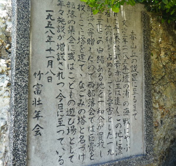 自転車を返して残りの時間は歩いて島内散策。 「なごみの塔」に登る。 島の伝説によると、壇ノ浦の闘いで竹富島に流れ着いた平家の落人赤山王の居城跡。 |