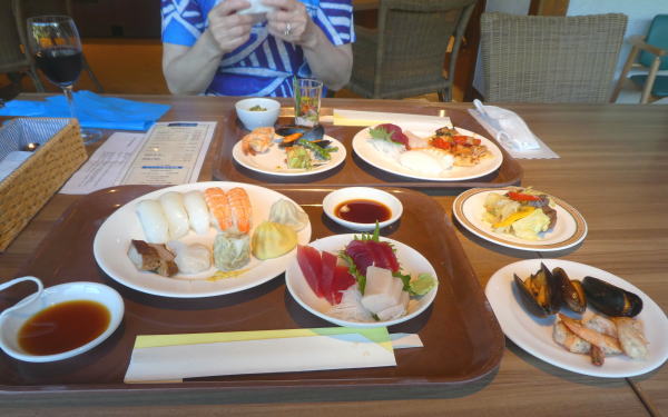 帰りのフェリーに乗って石垣島に戻ってくる。 ホテルの大浴場でしっかり汗を流して、今夜はホテルのレストランでビュッフェ夕食。新鮮なお刺身やムール貝もありアルコール飲み放題.格安@1000円。 |