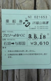 今日はこの旅行一番の楽しみにしていた、日本最西端の島 与那国島へ 日帰り旅行 雨や曇天なら行かないつもりでいたので、ずっと島の天気予報をチェックしていた。そして、明日の与那国は晴れの予報!を確認... 往きは船で行き、帰りは飛行機なので、出発前日のゆうべ18時過ぎ与那国島⇒石垣空港の飛行機チケットをぎりぎりで予約、JAL6000マイル使用。 日焼けの苦手なMは今日一日のんびり一人石垣島で過ごす。 |