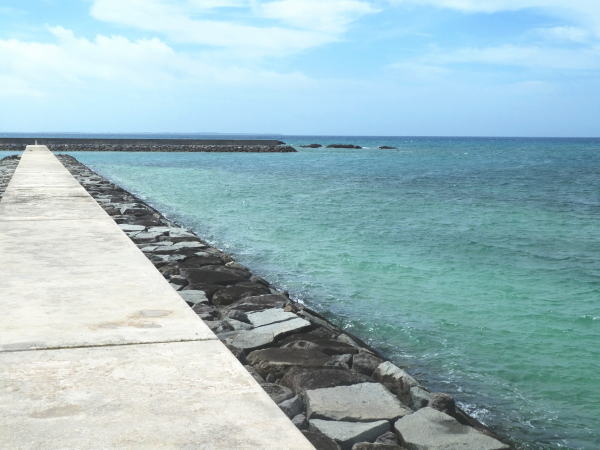 西桟橋は竹富島に稲作に適した農耕地がなかった為 対岸の西表島に田んぼを作り、島民が船で通うための港として1938年建設された。長さ約105㍍コンクリート造りの桟橋で1971年まで船の発着に利用されたが 現在桟橋とし使用されていない。 |
