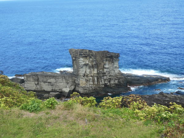 沿岸を更に進むと次に軍艦岩が現れる。 軍艦岩/サンニヌ台は はがれやすい板状の地層が積み重なって切り立った断崖が階段状に海まで続く雄大な地形。下りて行くと軍艦が停泊しているように見える軍艦岩が目の前に迫る。 |