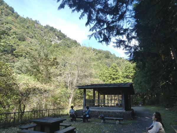 渓谷沿いの山道をしばらく進むと、松の木尾根先の東屋の前に出る。 ここからは鳩ノ巣の集落がきれいに見える。 |