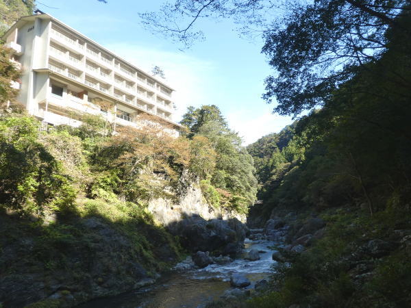 鳩ノ巣渓谷から見上げる先に「鳩ノ巣荘」 この宿に泊りたかったが、口コミ人気も好評で、いつも満員で今度は直前で当然予約できなかったが、いつか又きて泊まりたいと思う。 |