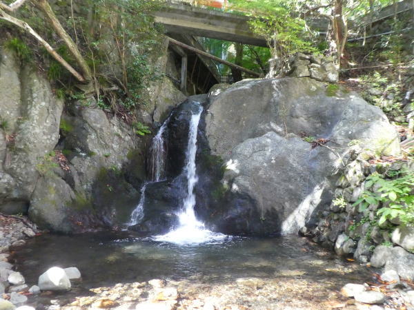 雲仙橋を渡ると道が二手に分かれ、右に行くと鳩ノ巣駅方面、左に進み、民宿.雲仙屋わきを下って水神の滝へ出る。 |