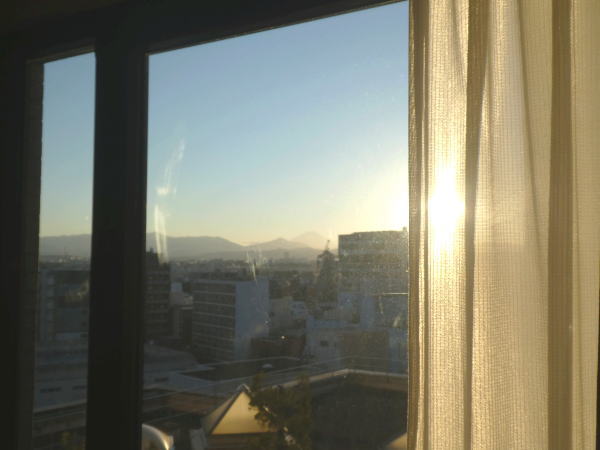 チェックイン。 コロナで空いているせいか、富士山の見える広い部屋にアップグレードしてくれた。 803号室の窓から夕焼けに染まった富士山がきれいに見える。 |