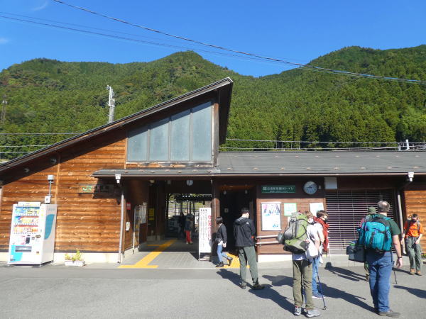 古里(こり)駅は「大多摩ウォーキングトレイル」の奥多摩方面へスタート地点のある最寄駅なので沢山の乗客が降りる。K&Mは軽装できたが、ほとんどの人は本格的な登山スタイルで気合充分。 |