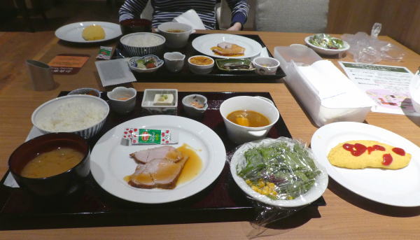ホテル日航立川の朝食は、一階レストラン紗灯(シャトー)で。 通常は人気のヴッフェだがコロナ禍で、全て器に盛付け分けられていたが、お肉ローストとオムレツだけは焼きたてが提供された。 |
