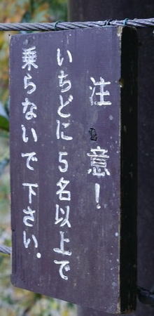 鳩ノ巣小橋を渡る。橋の定員は5名でそれ以上乗らないでと注意書き。 |