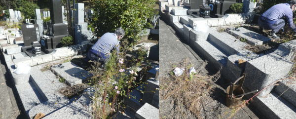 終の棲家(墓)に来るのは数年ぶり、相当 草ぼうぼうでないかと、覚悟してきたが、思ったよりひどくなく、雑草や枯草もあっというまに除去できた。 |