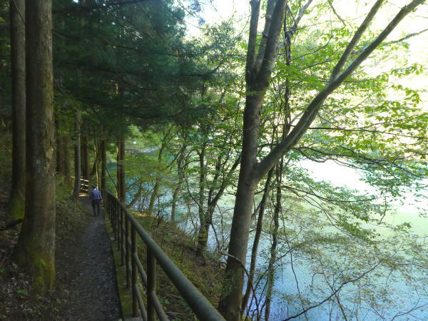 前方に白丸ダムが見える所あたりから渓流沿いを離れ、今日一番の急な登り道にさしかかる。 |