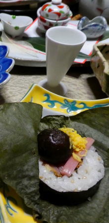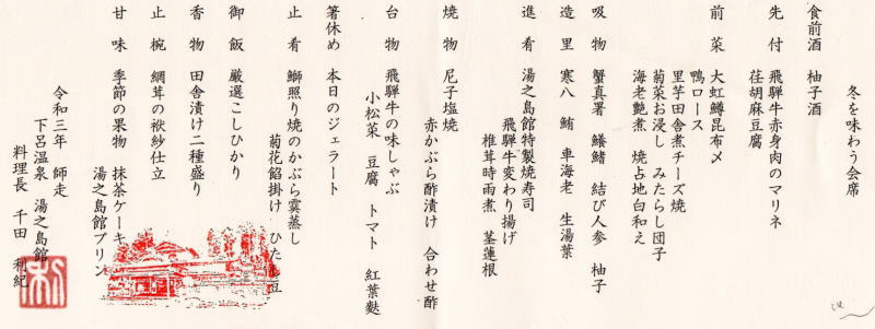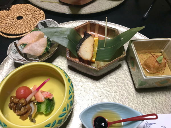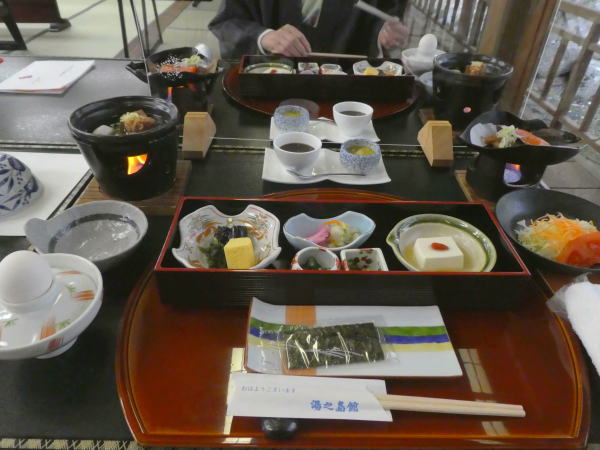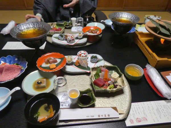 | 湯之島館の夕食は古風に全館・部屋食でゆっくりいただく。 |