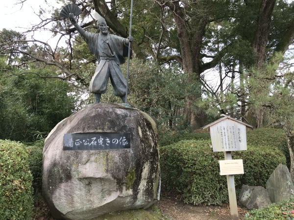 「清正の石曳きの像」 天守の石垣普請は、加藤清正に割り当てられ、巨石を運ぶにあたり、清正自ら石の上に乗り音頭をとったと伝えられている。 |
