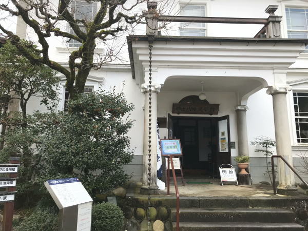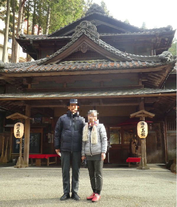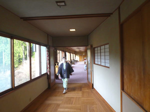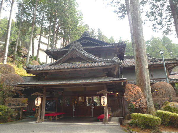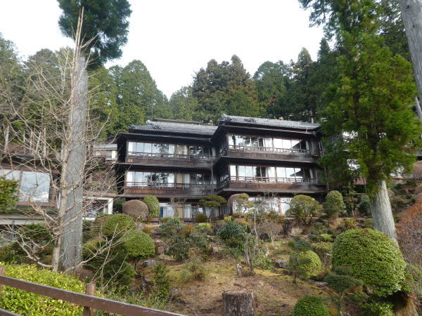 「湯之島館」14:50チェックイン。 創業昭和6年当時ままの玄関、渡り廊下、木造三階建て本館は登録有形文化財に指定されている。 |