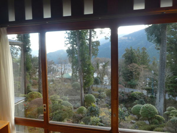 本館2F角部屋「乙女の間」真下に庭の見える眺めのいい部屋。 湯之島館は露天風呂付の部屋が多いのだが、我が家はお風呂のない部屋プランを選択。それでも一泊二人で\44000も、高い! |