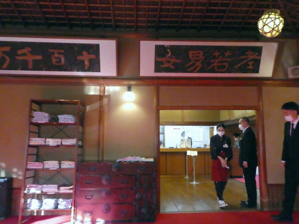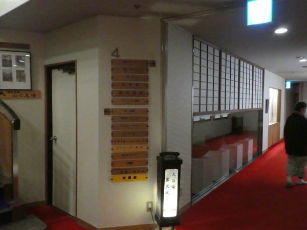 | 着替えてさっそく大浴場へ。 お風呂は赤じゅうたんの廊下から一階におり更に階段を下りた先で少し部屋からは遠いのが難点。 |