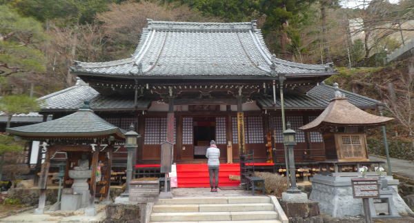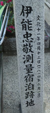 | 本陣.飛騨屋.武川久兵衛宅址は加恵瑠(かえる)神社になっていて神社前に建つ伊能忠敬宿泊地碑。こんな所まで測量で立寄ったのかと感動する。 ローソンでお昼におやつを買って、地蔵堂から温泉寺へ、173段の長く続く石段を上がる。 |
