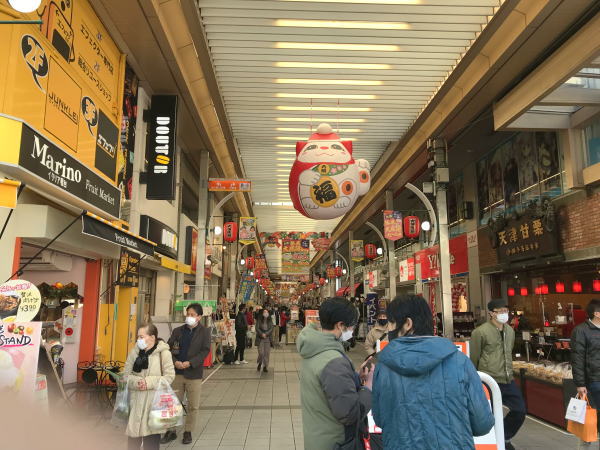 大須大通りに入る。中央に大須商店街のシンボル招き猫がぶらさがっている。 |