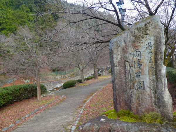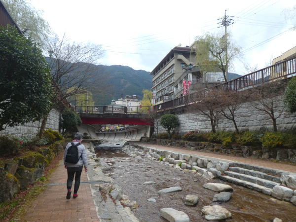 | 下呂温泉街の中央を流れる阿多野谷沿いを上流まで歩き帰りは、せせらぎの小径に降りて戻る。 |