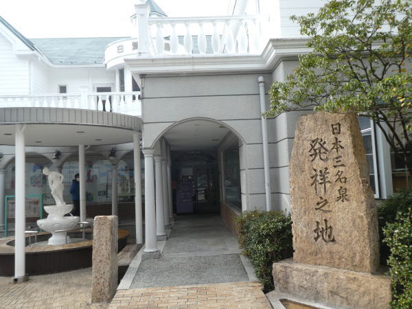 温泉寺の境内からながい石段を下ると下呂の温泉街に出る。 大正15年開場の歴史を持つ日帰り湯「白鷺の湯」の前に日本三名泉発祥の地碑。 |