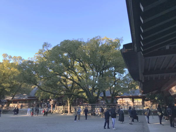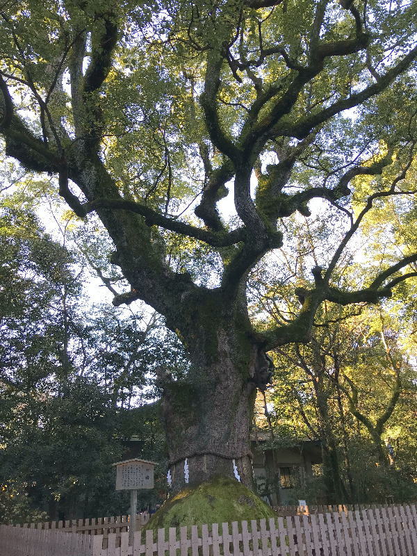 | 表参道第二鳥居の北に立つ大楠は、弘法大師お手植え伝説をもつ大楠で最もよく知られ 熱田神宮で三番目の太さをもつと言われ 樹齢1200年、樹高20m、目通り幹周7.5mの大きさ。 |