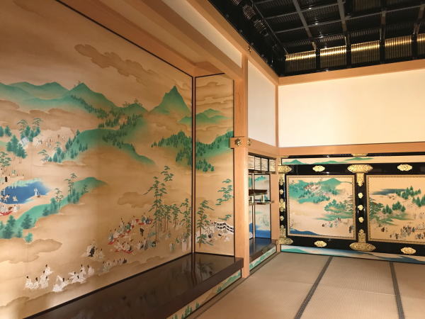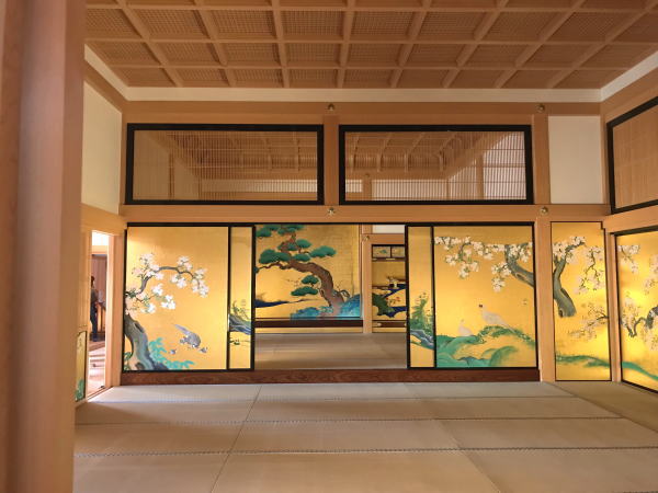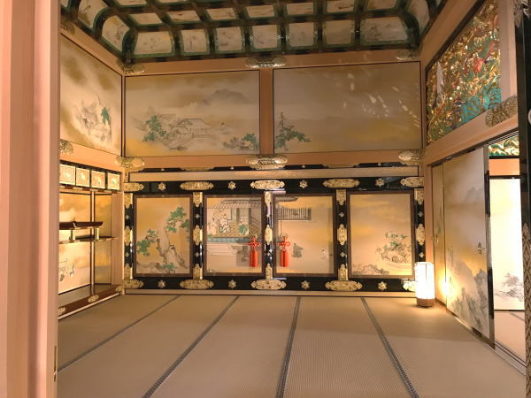 名古屋城の本丸御殿で最も豪華な部屋・上洛殿一之間と上段之間。彫刻と障壁画が金色に輝く、1634年(寛永11)三代将軍家光が京都に向かう途中、宿泊した上段之間。 |