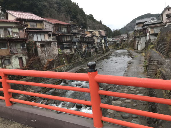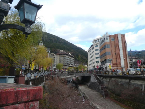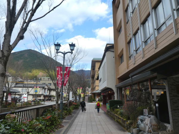 | 下呂温泉のメインストリートは阿多野通り、旅館やホテルや商店が阿多野谷沿いに建ち並び賑やか。 |